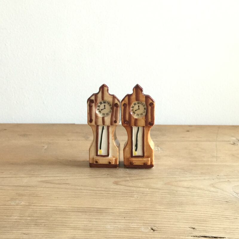 振り子掛時計型 陶器 ソルト&ペッパー入れ イギリスより入荷しましたが、 裏を見るとJapanの文字プリントがあります。 1950年代の日本からの輸出品 裏の蓋はありません。 サイズ:約 W3.3×H8.5×D2.8(cm) ◆われ・かけなどはありませんが、経年による、細かな擦れ、キズ、へこみ、よごれ、ハゲ、かすれ、錆等がある場合がございます、アンティークの特性をご理解の上ご購入ください。