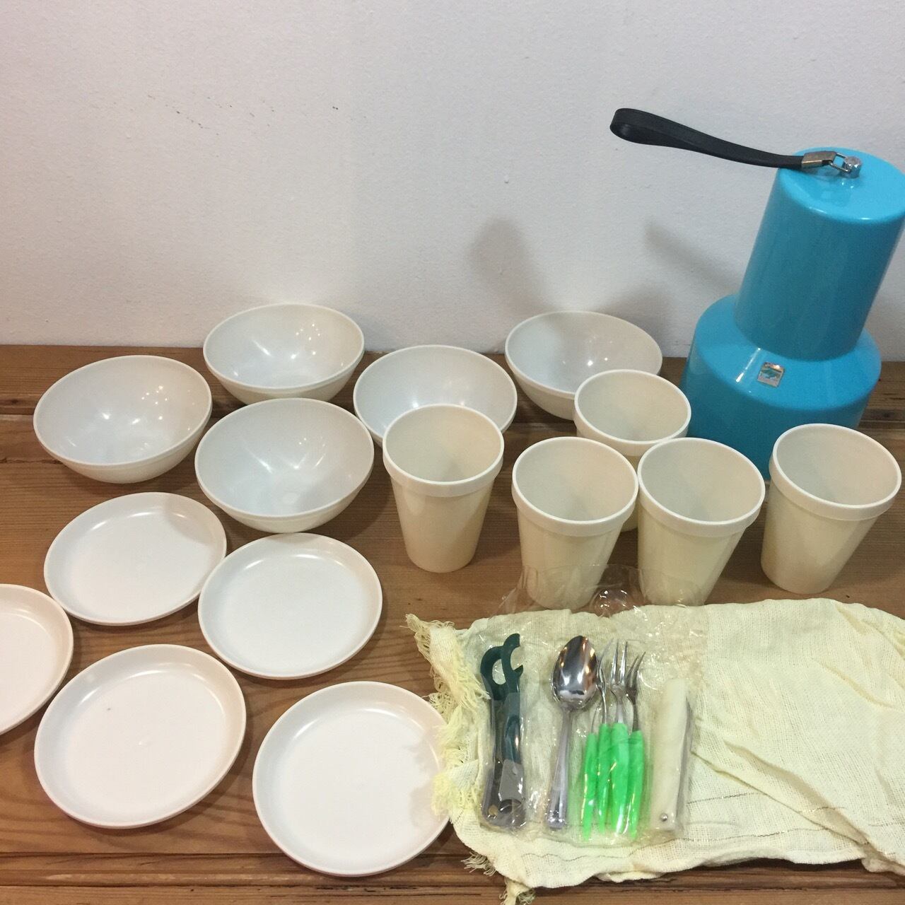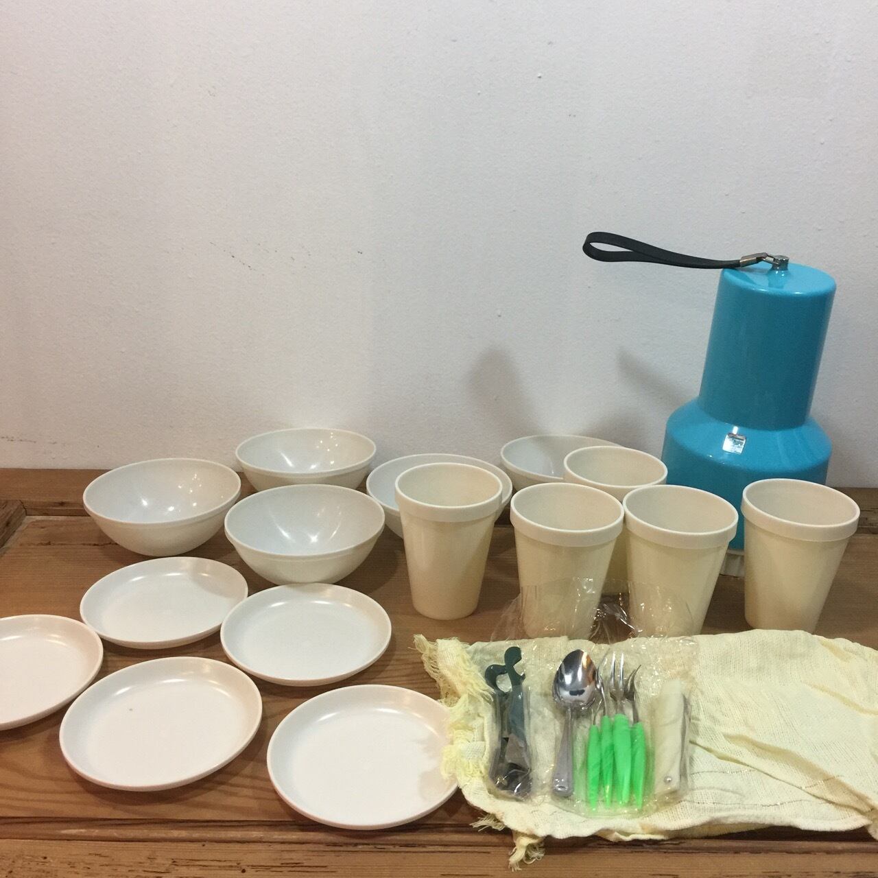 コップ5客、、小皿5枚、ボール皿5枚 スプーン5本、フォーク5本 、栓抜き&缶切、ナイフ、ナフキンが入ったセット